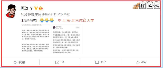 周琦转发了此前一位自媒体人发布的一篇关于周琦和新疆队闹剧的文章,他通过截图后以图片的形式发出来,并配了四个字:“未完待续”!