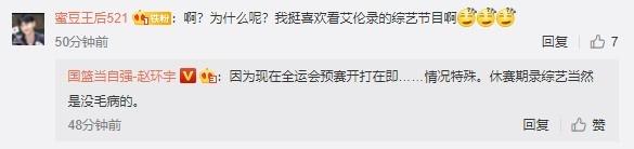 但是球迷对他的近况很好奇,有球迷“恶意调侃”郭艾伦和杨鸣又去参加湖南卫视的综艺了,休赛期了嘛,如果是没有国家队的任务,大侄子可能真的在录综艺!但是在评论区媒体人赵环宇回复“全运会开赛在即,休赛期录综艺当然没问题”