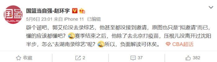 他也爆料了自己所知的郭艾伦状况,总决赛后一直在沈阳养伤,之前工作室也发过他手指和脚踝重伤的图片!赵环宇表示“辟个谣吧,郭艾伦没去录综艺,他甚至都没接到邀请,原图也只是“拟邀请”而已,懂的应该都懂吧?赛季结束之后,他除了去北京打疫苗,压根儿没离开过沈阳半步,怎么“去湖南录综艺”呢”