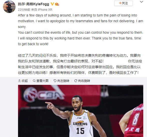 来源:24直播网05-06 19:3424直播网讯 5月6日,距离CBA总决赛已经过去5天的时间了,最终获得亚军的辽篮外援弗格在社交媒体上道歉,他表示: