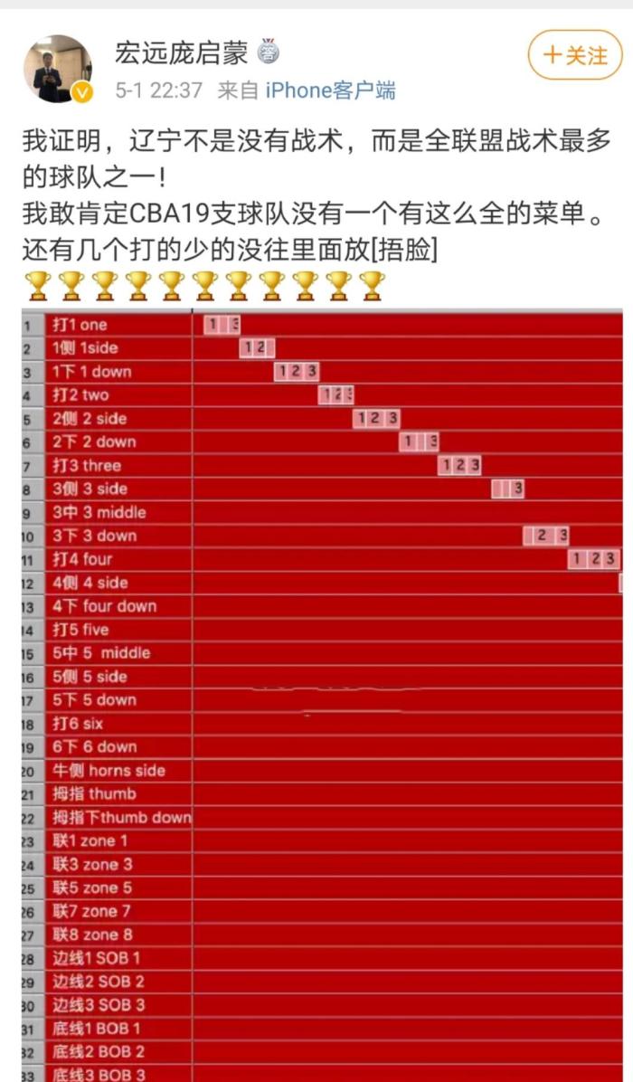 场下,庞启蒙团队也同样重要,他们会将对手的所有战术以及发起暗号进行肢解,然后让广东男篮的球员通过录像熟记,这样在比赛中,广东男篮的球员就很容易了解对方要打什么战术,比如说本赛季结束后,当辽宁男篮被球迷质疑没有战术的时候,庞启蒙就晒出了一张图,这张图记录着辽宁男篮的34套战术,以及辽宁男篮使用的频率。