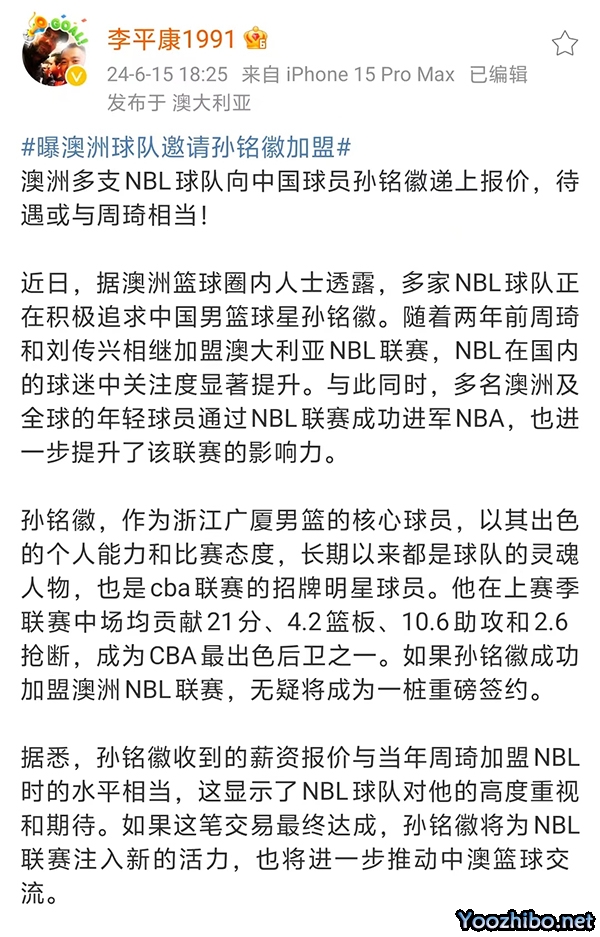 不过,近期,名记李平康也是曝光了孙铭徽的下家,身处澳大利亚的李平康表示:孙铭徽得到了多家澳洲NBL球队的报价,而且孙铭徽得到的报价和周琦当年的合同相当,根据欧洲篮球及NBA选秀专家王健报道,周琦在凤凰队的年薪约为400万人民币。这也意味着如果孙铭徽接受前往海外打球的橄榄枝,他的年薪至少会损失200万,不过有一点,如果孙铭徽前往海外打球,他还是有机会完成蜕变,并且完成商业价值的提升的。