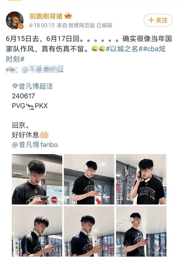 可是让人意外的是,在抵达上海开始男篮集训的第二天,曾凡博这边官宣退出了中国男篮集训队。曾凡博这边是啥情况呢?名记“别跑刚背猪”这边也是爆料:“6月15日去,6月17日回。。。确实很像当年国家队作用,真有伤真不留。”