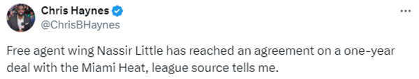 来源:24直播网09-24 11:2524直播网讯 北京时间9月24日,据名记Chris Haynes的报道,热火已经与自由球员前锋纳西尔-利特尔达成了一份一年合同,成为热火队大名单第15名球员。