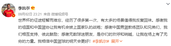 森林狼官推晒出李凯尔对阵菲律宾的数据,配文写道:李凯尔在男篮世界杯上履行了职责(中国国旗)。