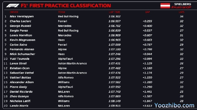 2022年F1奥地利大奖赛第1次练习赛成绩表: