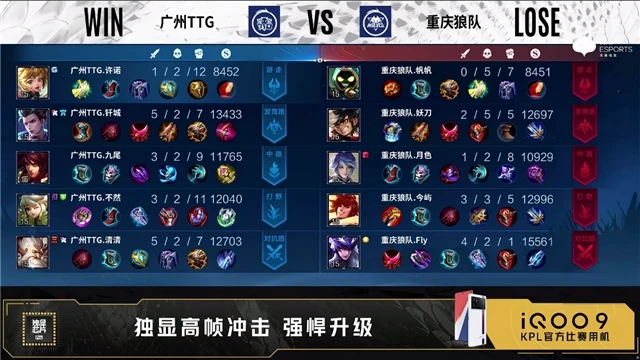 第一局开局重庆狼队入侵敌方野区,50秒双方野区团打出1换1。2分15秒广州TTG对抗路击杀澜。2分37秒重庆狼队拿下先知主宰。2分51秒广州TTG拿下暴君。3分35秒重庆狼队发育路击杀干将莫邪。5分08秒重庆狼队摧毁敌方发育路外塔。5分10秒对抗路团重庆狼队打出1换2。6分06秒中路下河道团双方1换1。7分09秒广州TTG拿下主宰,随后摧毁敌方对抗路外塔。7分57秒重庆狼队拿下暴君,中路团双方1换1。9分15秒中路团重庆狼队打出1换2。11分42秒重庆狼队拿下暗影暴君,团战重庆狼队打出1换3。13分15秒重庆狼队野区击杀马可波罗,随后拿下暗影主宰。13分52秒重庆狼队先后摧毁敌方中路、对抗路二塔。15分39秒广州TTG中路击杀猪八戒。15分52秒重庆狼队拿下暗影暴君。16分45秒重庆狼队摧毁敌方发育路二塔。17分19秒重庆狼队中路击杀东皇太一。17分56秒重庆狼队摧毁敌方对抗路高地塔。18分44秒重庆狼队摧毁敌方中路高地塔。19分44秒重庆狼队高地处击杀干将莫邪。20分钟高地团广州TTG打出2换3。22分钟中路团广州TTG打出1换2。23分20秒野区团广州TTG打出2换4。24分12秒广州TTG拿下风暴龙王。26分15秒野区团广州TTG打出0换2。27分04秒广州TTG先后摧毁敌方中路、发育路高地塔。28分25秒中路上河道团广州TTG打出0换2。28分52秒广州TTG拿下风暴龙王。30分21秒广州TTG摧毁敌方水晶拿下比赛。