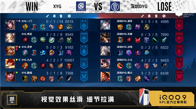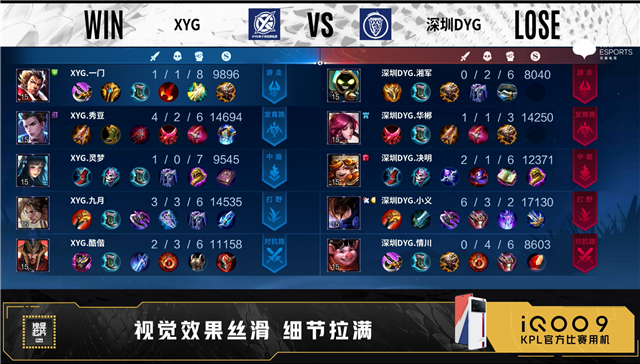 开局深圳DYG中上换线。3分47秒深圳DYG拿下暴君。5分04秒中路团战深圳DYG击杀太乙真人,拿下一血。5分59秒深圳DYG摧毁敌方发育路外塔。6分49秒对抗路团战深圳DYG击杀太乙真人,摧毁敌方对抗路外塔,XYG摧毁敌方发育路外塔。7分40秒深圳DYG拿下主宰。9分01秒深圳DYG摧毁敌方对抗路二塔,拿下暴君。9分37秒深圳DYG拿下暗影主宰,摧毁敌方中路外塔。10分42秒深圳DYG拿下暗影主宰。11分51秒深圳DYG摧毁敌方发育路二塔、中路二塔,拿下暗影暴君。13分33秒高地团战XYG击杀夏侯惇,守住对抗路高地。15分39秒深圳DYG拿下暗影主宰。16分17秒XYG摧毁敌方对抗路外塔,深圳DYG拿下暗影暴君。17分59秒深圳DYG摧毁敌方对抗路高地。23分42秒发育路团战深圳DYG2换4,摧毁水晶拿下比赛。