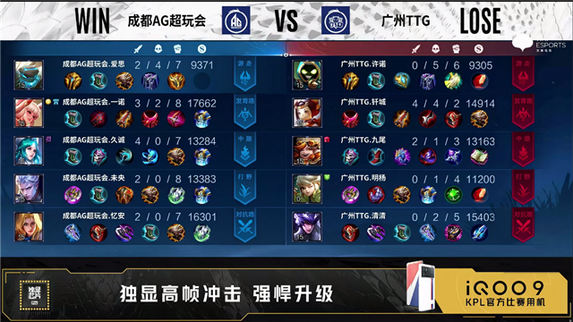 第一局双方常规开局。3分27秒广州TTG发育路击杀盾山拿下一血。3分36秒成都AG拿下暴君。4分38秒广州TTG摧毁敌方发育路外塔,团战成都AG击杀太乙真人。5分40秒双方互换边路外塔。5分43秒广州TTG拿下先知主宰。6分10秒野区团成都AG打出0换2。8分05秒成都AG拿下暴君,暴君处团战广州TTG击杀盾山。9分50秒成都AG摧毁敌方对抗路外塔。10分25秒广州TTG中路击杀盾山。10分45秒主宰处团成都AG打出0换2。11分36秒成都AG拿下暗影暴君,随后摧毁敌方中路外塔。12分56秒成都AG野区击杀太乙真人。13分31秒成都AG拿下暗影主宰。14分07秒成都AG摧毁敌方发育路二塔。15分08秒成都AG摧毁敌方中路二塔。15分25秒成都AG拿下暗影暴君。16分47秒广州TTG对抗路击杀盾山。18分19秒广州TTG摧毁敌方对抗路二塔。20分24秒对抗路团成都AG打出1换3。21分钟成都AG摧毁敌方对抗路高地塔。22分42秒成都AG拿下风暴龙王。23分39秒高地团成都AG打出0换4。23分55秒成都AG摧毁敌方水晶拿下比赛。