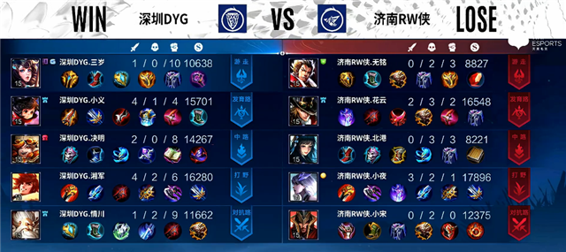 2分10秒下路团战,虞姬拿下一血。3分40秒澜拿下暴君,镜拿下主宰。4分40秒刘邦被击杀。5分45秒狄仁杰推掉下路一塔。7分20秒河道团战,虞姬被击杀。8分40秒澜拿下暴君。9分钟狄仁杰推掉中路一塔。10分20秒澜拿下主宰。10分40秒镜拿下暴君。12分50秒中路团战,深圳DYG打出0换2。13分34秒狄仁杰推掉中路高地塔。14分钟镜拿下暴君。15分30秒中路团战,深圳DYG团灭济南RW侠。15分57秒深圳DYG推掉水晶率先拿下赛点。