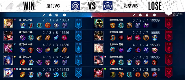 双方和平开局。1分40秒中路团战,镜拿下一血。2分08秒镜拿下暴君,裴擒虎拿下主宰。3分15秒下路团战,镜被击杀,北京WB推掉下路一塔。5分13秒上路团战,北京WB打出0换2。5分30秒中路团战,双方2换2,北京WB推掉中路一塔。6分钟裴擒虎拿下暴君。7分58秒裴擒虎拿下主宰。10分30秒李元芳拿下主宰。11分钟李元芳拿下暴君。11分45秒裴擒虎推掉中路高地塔,团战厦门VG打出1换2。14分10秒高地团战,厦门VG打出1换2。15分钟裴擒虎拿下暴君。15分45秒中路团战,厦门VG打出1换2。18分16秒北京WB中路一塔被破。19分钟中路团战,双方1换1。19分16秒野区团战,厦门VG打出0换2。20分40秒风暴龙王团,关羽被击杀。21分44秒裴擒虎拿下风暴龙王。22分40秒上路团战,厦门VG团灭北京WB。23分47秒马可波罗推掉中路高地塔。25分30秒河道团战,李元芳被击杀。26分40秒镜拿下风暴龙王。28分16秒马可波罗推掉下路高地塔。29分05秒厦门VG推掉水晶追回一分。