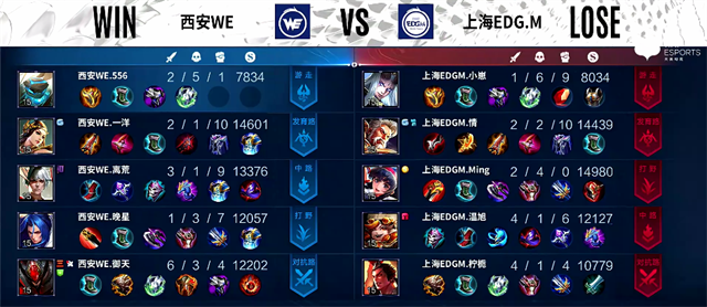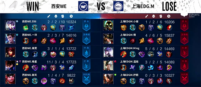 双方和平开局。2分11秒暴君团,娜可露露拿下暴君和一血,团战上海EDG.M打出0换2。5分钟黄忠推掉下路一塔。6分钟下路团战,双方1换1。6分13秒橘右京推掉下路一塔。7分钟娜可露露拿下暴君。7分15秒橘右京被击杀。8分钟上路团战,双方1换1。9分20秒中路团战,双方2换2。10分50秒黄忠推掉下路二塔,娜可露露拿下暴君。11分20秒娜可露露被击杀。12分50秒娜可露露拿下主宰。14分40秒高地团,双方1换1。15分33秒娜可露露拿下暴君。18分钟上海EDG.M推掉上路高地塔,团战双方1换1。17分钟娜可露露拿下主宰。18分30秒高地团,西安WE打出2换5团灭上海EDG.M,白起拿下三杀。19分38秒西安WE推掉水晶率先拿下赛点。