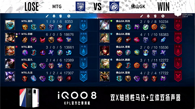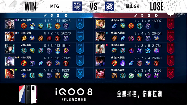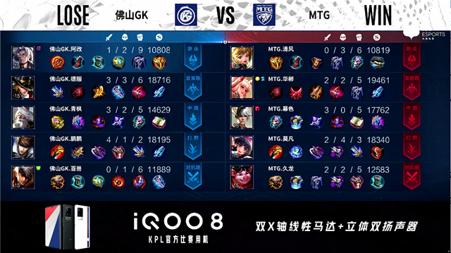 2分18秒,MTG控下先知主宰。3分52秒,佛山GK西施击杀老夫子拿下一血。4分33秒,佛山GK破掉MTG下一塔,随后露娜控下暴君。6分10秒,佛山GK击杀虞姬。7分10秒,双方1换1。8分04秒,佛山GK控下先知主宰。9分50秒,佛山GK破掉MTG中一塔。11分12秒,佛山GK控下暗影主宰,随后MTG控下暗影暴君,双方团战佛山GK打出0换2。14分10秒,佛山GK破掉MTG下二塔。15分16秒,河道团,MTG打出0换2,随后控下暗影主宰。15分44秒,MTG破掉佛山GK中路两座外塔及上、下路二塔。16分47秒,MTG拿下暗影暴君。17分10秒,佛山GK击杀貂蝉。18分50秒,MTG强拆掉佛山GK上高地。19分25秒,双方团,MTG打出1换4,虞姬拿下三杀。19分55秒,MTG中路一波摧毁佛山GK水晶赢下比赛。
