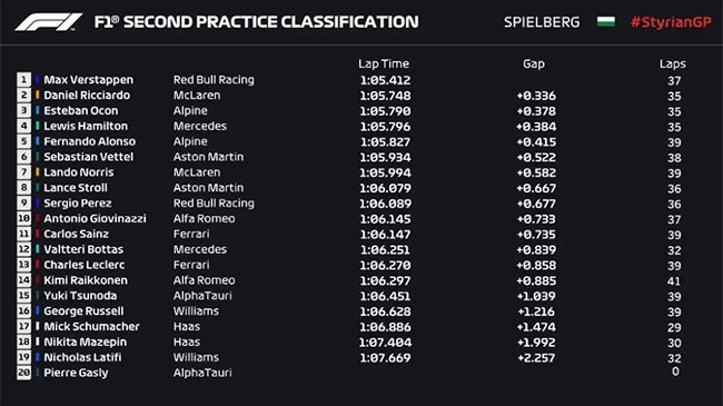 2021F1施蒂利亚大奖赛二练最终成绩: