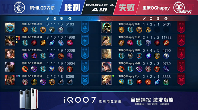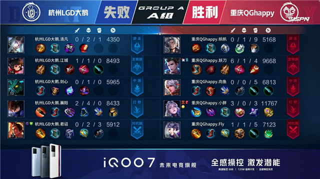 双方常规开局,2分01秒上路杭州LGD大鹅打出0换2。2分51秒重庆QG拿下暴君。3分53秒重庆QG中路击杀橘右京。4分09秒杭州LGD大鹅下路狄仁杰反杀盘古。5分46秒双方互换边路外塔。6分05秒重庆QG拿下主宰。6分32秒野区团战重庆QG打出0换2。6分59秒杭州LGD大鹅中路打出1换2。7分49秒重庆QG野区击杀狄仁杰。11分51秒杭州LGD大鹅拿下暗影暴君。13分14秒杭州LGD大鹅摧毁敌方中路外塔。13分44秒中路团战重庆QG打出1换3。16分26秒杭州LGD大鹅摧毁敌方上路高地塔。19分39秒杭州LGD大鹅野区击杀公孙离。20分30秒重庆QG抢下风暴龙王并打出0换3。20分57秒重庆QG摧毁敌方中路高地塔。21分13秒重庆QG摧毁敌方水晶拿下比赛。