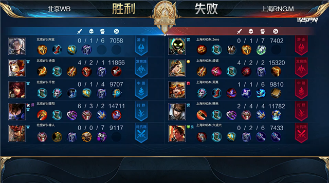 双方常规开局,1分08秒上海RNG.M拿下中路河道之灵。2分13秒上海RNG.M拿下暴君。4分03秒北京WB上路击杀赵云拿到一血。4分24秒北京WB上路击杀吕布。5分04秒北京WB摧毁敌方下路外塔。7分38秒野区双方打野互换。8分35秒北京WB拿下暴君。9分16秒北京WB摧毁敌方中路外塔。9分43秒北京WB摧毁敌方上路二塔。11分29秒北京WB拿下暗影暴君,团战双方1换1。13分50秒野区团战上海RNG.M打出1换2。15分45秒北京WB拿下暗影主宰,上海RNG.M拿下暗影暴君。16分13秒中路团战上海RNG.M打出0换2。16分25秒上海RNG.M摧毁敌方下路高地塔。16分36秒上海RNG.M摧毁敌方中路二塔。17分05秒高地团战北京WB打出1换2,鲁班七号拿到二连击破。17分31秒北京WB上路击杀太乙真人。17分39秒上路团战北京WB团灭对手。17分51秒北京WB摧毁敌方水晶拿下比赛。