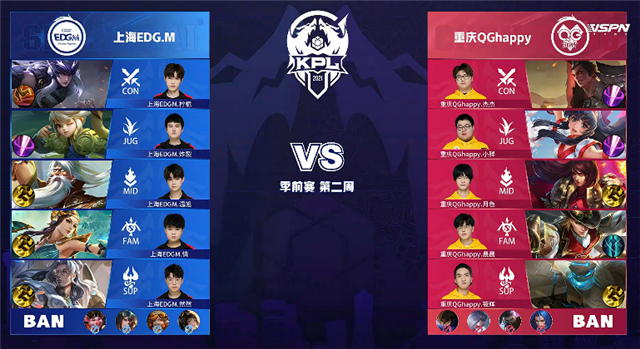 开局上海EDG.M马超吃中上两线发育。2分24秒重庆QGhappy拿下主宰。4分钟娜可露露拿下暴君。4分43秒马可波罗推掉下路一塔。5分14秒下野区团战,虞姬拿下一血。5分58秒,重庆QGhappy推掉中路一塔,同时重庆QGhappy下路一塔被破。6分13秒上海EDG.M推掉上路一塔。7分10秒上海EDG.M拿下主宰。8分20秒娜可露露拿下暴君,但吕布被击杀。9分46秒马可波罗推掉下路二塔。10分16秒娜可露露拿下暴君,双方团战中虞姬被击杀。11分37秒重庆QGhappy拿下主宰。14分44秒重庆QGhappy拿下暴君。15分23秒下野区团战,重庆QGhappy打出1换2,马可波罗拿下双杀。16分23秒重庆QGhappy推掉中路和上路高地塔。18分钟重庆QGhappy强攻下路高地塔,团战上海EDG.M打出1换2。19分钟娜可露露拿下暴君。19分48秒中路二塔处团战,鲁班大师被击杀。20分24秒下野区团战,重庆QGhappy打出2换4。21分06秒,重庆QGhappy攻破水晶拿下本场比赛胜利。