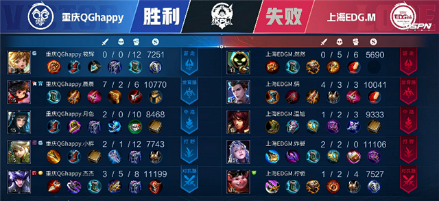 开局重庆QGhappy三路换线。2分11秒露娜拿下暴君。3分40秒重庆QGhappy入侵野区,周瑜拿下一血。4分13秒李元芳推掉上路一塔,同时拿下双杀。5分17秒上海EDG.M拿下主宰。5分55秒中路上河道团战,马超被击杀。6分13秒重庆QGhappy推掉下路一塔。7分钟上海EDG.M推掉下路一塔。7分33秒中路团战,重庆QGhappy打出0换2。8分10秒中路上河道再次团战,周瑜被击杀。8分47秒重庆QGhappy推掉中路一塔。9分50秒重庆QGhappy拿下主宰。10分10秒重庆QGhappy强攻高地塔,团战打出1换4,同时重庆QGhappy推掉中路高地塔。11分24秒猪八戒拿下暴君。12分05秒重庆QGhappy推掉下路高地塔。12分30秒野区团战,上海EDG.M打出0换3。13分14秒狄仁杰推掉中路一塔。14分30秒中路二塔处团战,太乙真人被击杀。14分46秒重庆QGhappy强攻水晶率先拿下一局。