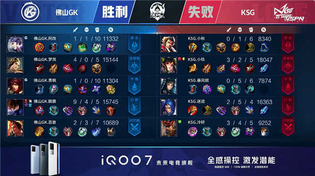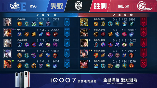 双方平稳开局,1分9秒佛山GK野区击杀橘右京拿到一血。1分20秒佛山GK野区再杀廉颇。2分18秒佛山GK拿下暴君。2分31秒佛山GK周瑜野区单杀西施。4分16秒佛山GK拿下暴君。5分11秒佛山GK上路击杀橘右京。6分26秒佛山GK摧毁敌方上路外塔。7分48秒中路团战佛山GK打出0换3,澜拿到三连决胜。8分18秒佛山GK澜高地1换2。9分38秒上路团战佛山GK击杀西施并摧毁敌方中路二塔。10分14秒佛山GK下路击杀橘右京。10分25秒KSG拿下暗影主宰,佛山GK拿下暗影暴君。10分42秒佛山GK摧毁敌方中路高地塔。11分02秒高地团战KSG打出1换2。12分32秒KSG下路击杀澜。13分23秒KSG摧毁敌方中路外塔。14分43秒佛山GK拿下暗影暴君。15分14秒高地团战KSG打出1换2,佛山GK摧毁敌方下路高地塔。16分06秒KSG中路击杀澜。16分27秒KSG拿下暗影主宰。17分17秒KSG摧毁敌方下路二塔。19分30秒KSG拿下暗影暴君。19分58秒野区团战佛山GK打出1换3。20分30秒佛山GK摧毁水晶拿下比赛。