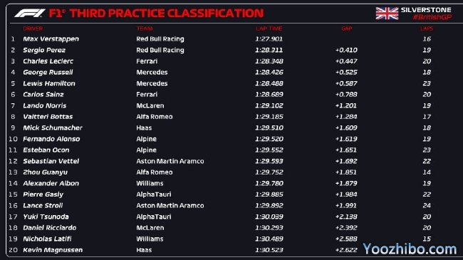2022年F1英国大奖赛第3次练习赛成绩表