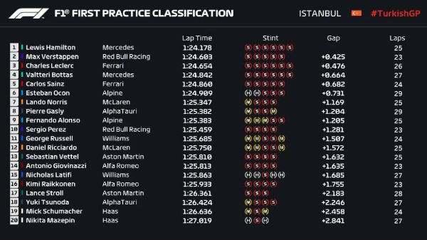 2021F1土耳其大奖赛一练成绩: