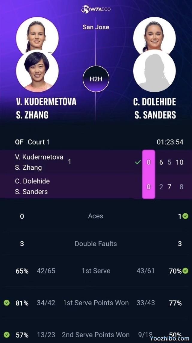 来源:24直播网08-05 11:3624直播网08月05日讯 结束的WTA500圣何塞站女双1/4决赛的一场焦点战中,头号种子、中国选手张帅与搭档库德梅托娃,以2-1艰难淘汰多勒海德/桑德斯,率先晋级四强。
