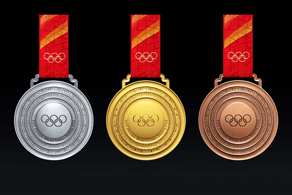 奖牌正麵中央刻有奥运五环,周围刻有北京2022年第24届冬季奥林匹克运动会的英文:XXIV Olympic Winter Games Beijing 2022。圆环做打凹处理,设计灵感源自传统弦纹玉璧,上麵有取自中国传统纹样的浅刻,冰雪纹代表冬奥会,祥云纹传达了吉祥和美好的寓意。