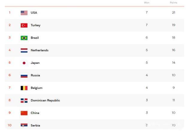 巨额奖金在前,六朵金花驰援的女排还有机会夺冠吗?答案是微乎其微,为什么呢?我们先来看看现在的积分,如今积分榜第一的美国队7战全胜,她们的积分来到了21分,而中国女排因为糟糕的战绩,目前只有10分的积分。