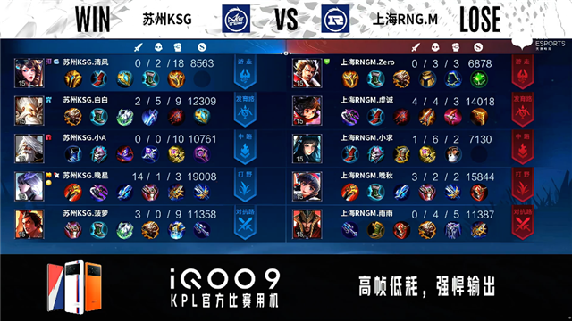 2分40秒娜可露露拿下暴君。4分钟周瑜推掉上路一塔。4分50秒下路团战,苏州KSG打出1换2,伽罗拿下一血,狄仁杰推掉下路一塔。5分20秒云缨拿下主宰。5分50秒狄仁杰推掉上路一塔。6分18秒周瑜被击杀。7分钟娜可露露拿下暴君。9分钟夏侯惇被击杀。9分30秒嬴政推掉中路一塔,云缨拿下主宰。12分钟盾山被击杀。12分30秒云缨拿下暴君。14分钟云缨拿下主宰。15分40秒狄仁杰推掉中路高地塔。16分钟梦奇拿下暴君。18分钟云缨拿下主宰。19分20秒下路团战,上海RNG.M2换5团灭苏州KSG。19分51秒上海RNG.M推掉水晶拿下本场比赛胜利。