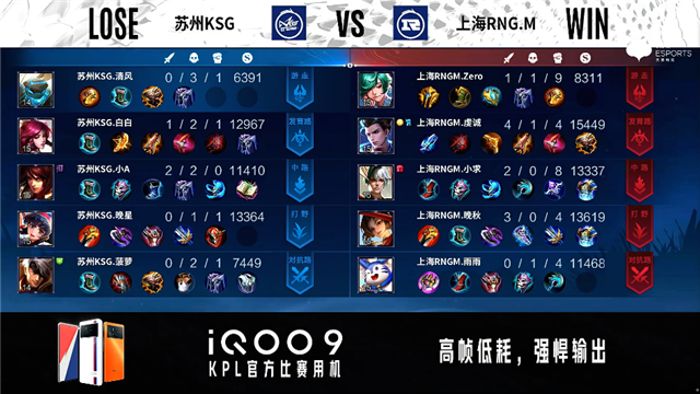 2分17秒娜可露露拿下暴君。2分50秒野区团战,镜拿下一血,娜可露露拿下主宰。5分钟上路团战,双方2换2。7分钟上路团战,上海RNG.M打出1换2。7分30秒娜可露露拿下暴君。7分55秒苏州KSG上路一塔被破。8分22秒镜拿下主宰。11分钟镜拿下暴君。12分钟野区团战,苏州KSG打出0换3。12分25秒镜拿下主宰,老夫子推掉中路一塔。13分50秒镜被击杀。15分钟暴君团,苏州KSG打出1换3。15分38秒镜拿下暴君。17分20秒娜可露露拿下主宰,老夫子被击杀。19分20秒野区团战,苏州KSG打出0换3。20分17秒老夫子推掉中路高地塔。21分钟苏州KSG推掉水晶追回一分。