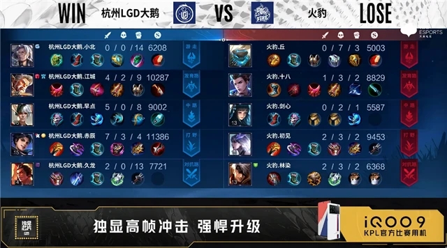 开局杭州LGD大鹅入侵野区反掉红BUFF。2分42秒杭州LGD大鹅反掉红BUFF。3分35秒发育路团战火豹打出1换2并拿到一血。5分36秒杭州LGD大鹅摧毁敌方中路外塔。5分45秒杭州LGD大鹅拿下暴君,火豹拿下主宰。6分18秒野区团战火豹打出0换3。6分48秒火豹野区击杀大乔。7分59秒杭州LGD大鹅摧毁敌方对抗路外塔。8分31秒火豹野区击杀周瑜。9分05秒杭州LGD大鹅击杀娜可露露并摧毁敌方发育路二塔。10分13秒火豹拿下暗影暴君,野区团战火豹打出0换2。11分18秒火豹拿下暗影主宰。12分32秒火豹摧毁敌方发育路二塔。12分49秒火豹打出0换2并摧毁敌方发育路高地塔。14分04秒杭州LGD大鹅拿下暗影暴君并击杀不知火舞。15分11秒火豹拿下暗影主宰并打出1换3。15分46秒杭州LGD大鹅对抗路击杀蒙犽。16分52秒火豹发育路击杀大乔。17分13秒火豹中路击杀周瑜。17分56秒火豹摧毁敌方水晶拿下比赛。