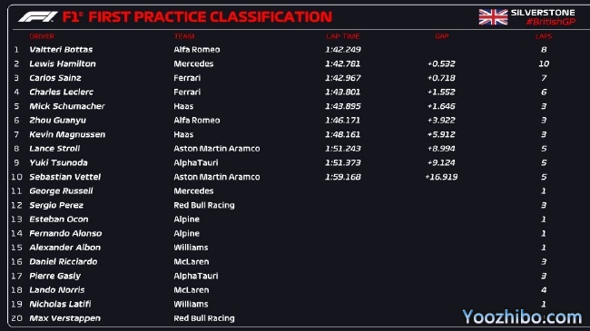 24直播网讯 2022年F1英国大奖赛第1次练习赛在银石赛道结束,受到雨水影响,只有一半车手在赛道上做出了有效成绩。阿尔法罗密欧车队博塔斯拿到了单圈最速,汉密尔顿和小塞恩斯二三位。中国车手周冠宇第六。希望北京时间23点的二练可以让大家尽情发挥!