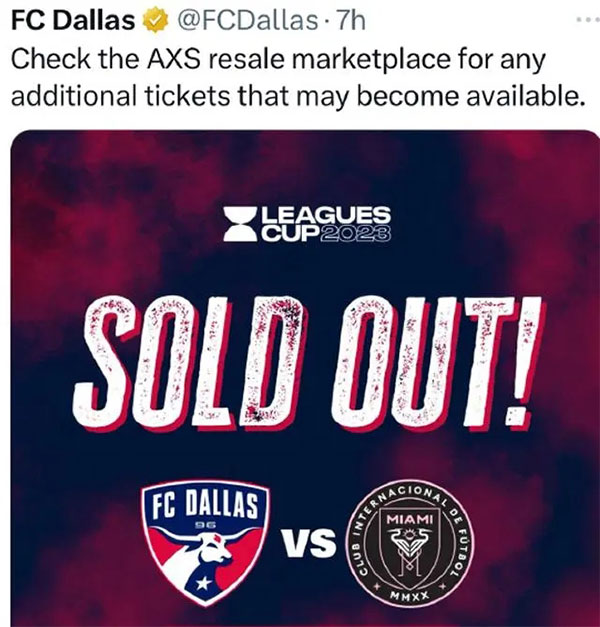 如果考虑到比赛门票的价格,票房的火爆程度就更加惊人了,最便宜的座位票价高达 299 美元,而官方转售门票的价格则超过了 600 美元。共有 20000 人将挤进FC达拉斯的丰田体育场,观看梅西在迈阿密国际的首个客场比赛。