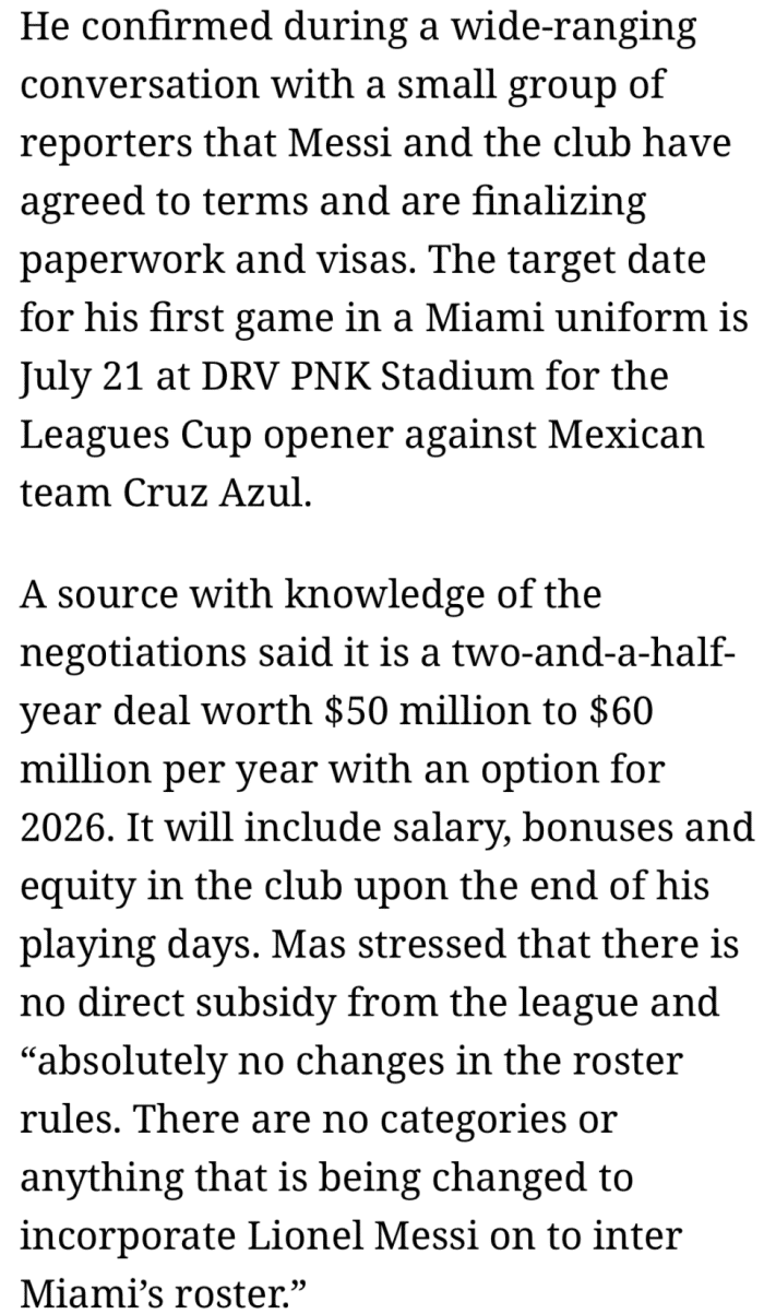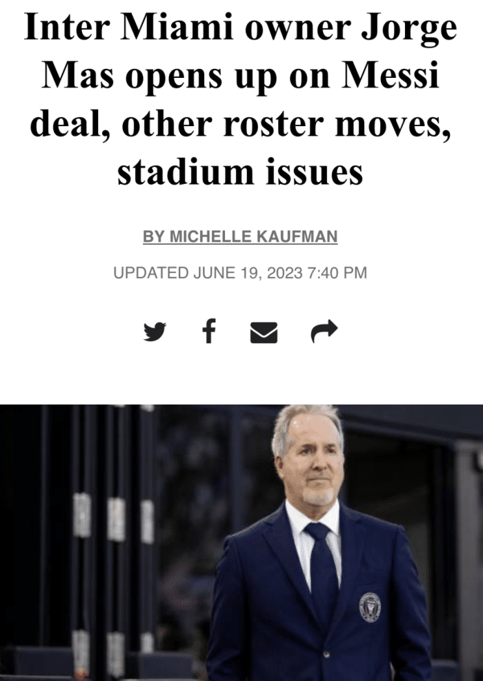 24直播网06月20日讯 ,迈阿密先驱报记者Michelle Kaufmann采访了迈阿密国际老板豪尔赫-马斯。而马斯也在采访中证实,梅西已经和俱乐部已经就条款达成一致,正在敲定最后的文书工作和签证。马斯还表示,梅西将会在7月21日迎来迈阿密国际生涯的首秀。他将会在DRV PNK体育场,与墨西哥球队蓝十字的美墨联赛杯揭幕战亮相。