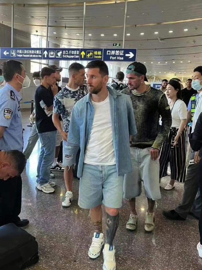 由于北京正值6月盛夏,天气十分炎热。梅西与几位阿根廷国家队队友衣着也十分清爽随性。梅西穿着宽松的蓝色衬衫,白色T恤内衬,牛仔中裤,背着小背包。