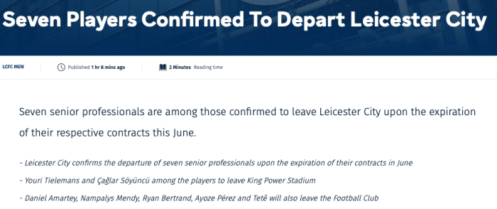 降级后沦为球员超市?莱斯特城官宣7王牌离队!比利时国脚引哄抢