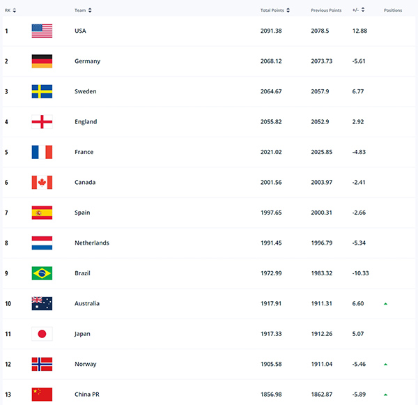 国际足联公布最新女足排名 中国女足上升一位排名第13