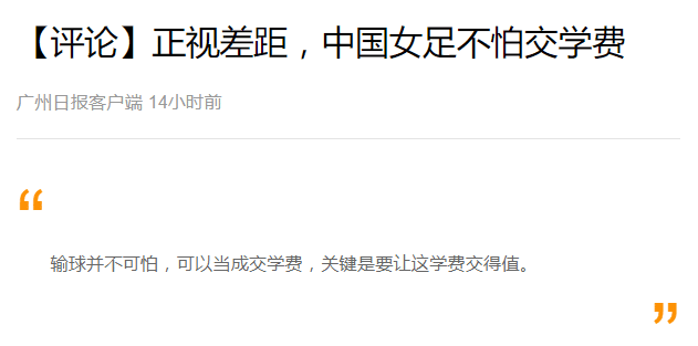 24直播网02月18日,中国女足在一场热身赛中1-4不敌瑞典女足。赛后广州媒体《广州日报》表示,中国女足输球不可怕,就当交学费。