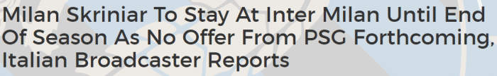 不过什克里尼亚尔将会为国米效力到本赛季结束,巴黎无意在冬窗求购他,他们将会等到夏窗再免签这名斯洛伐克中卫。