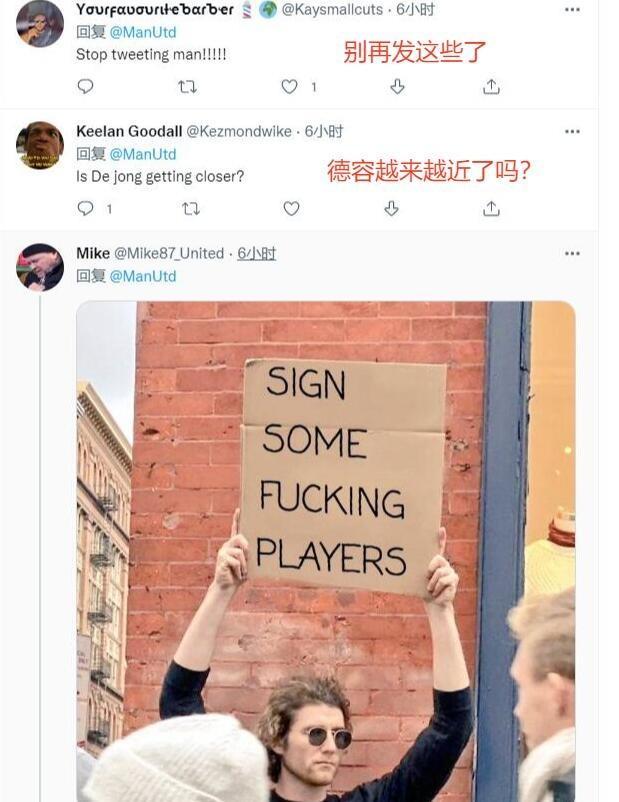 24直播网06月26日讯 目前,全球夏窗已经开启,但是至今曼联仍未签下任何一人,球迷对俱乐部的引援进展越发不满,在官推下强烈要求买人。