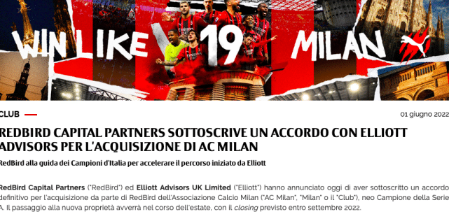 来源:24直播网06-01 19:1224直播网06月01日讯 下午,红鸟资本合作伙伴(“红鸟”)与埃利奥特英国顾问集团(“埃利奥特”)宣布,他们已就红鸟收购新科意甲冠军AC米兰俱乐部达成最终协议。本次所有权转让将在夏天进行,预计最迟今年9月完成。据悉,这笔交易的估值为12亿欧元,埃利奥特集团将继续持有AC米兰少数股份。