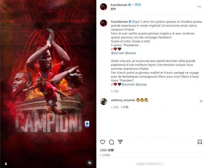 24直播网05月28日讯 凯西写道:5年时光,用一个冠军来告别无疑是最好的告别方式,这是一种特别的情感:我们是意大利冠军!