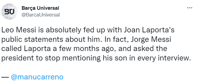 塞尔电台透露,梅西的团队对于他们再一次被拉波尔塔提及已经不胜其烦,实际上,梅西的父亲兼经纪人豪尔赫-梅西在几个月前就告诉拉波尔塔,让他不要再讨论自己的儿子。