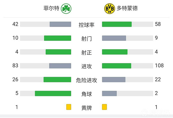 第25分钟,格雷罗左路跟上在禁区内一脚低射被门将扑出,布拉特后点跟上轻松补射破门,多特蒙德1-0菲尔特。