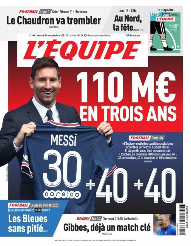 24直播网9月18日讯 今日,针对梅西的薪资,《队报》今日头版曝光了相关细节,报道称,梅西的3年薪水共计至少税后1.1亿欧。