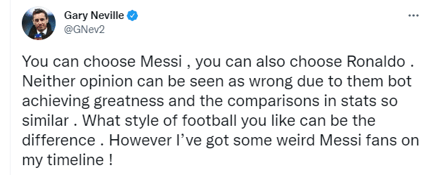24直播网讯 9月15日消息,加里-内维尔表示,选择梅西或C罗作为历史最佳都没错,但一些梅西球迷很古怪。