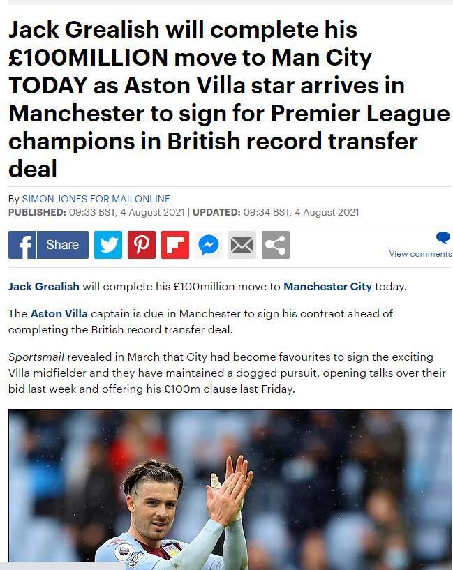 来源:24直播网08-05 10:4024直播网讯 今日,据英媒《每日邮报》消息,阿斯顿维拉队长格拉利什今天将与曼城签约,转会费1亿英镑。