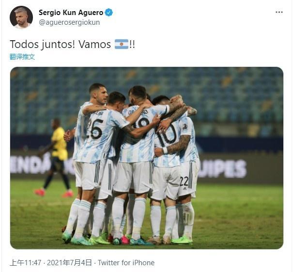 24直播网讯 北京时间7月4日,美洲杯1/4决赛,阿根廷3-0厄瓜多尔进入四强。赛后阿圭罗晒出了全队在一起庆祝的图片,并写道:“团结在一起!加油阿根廷!”