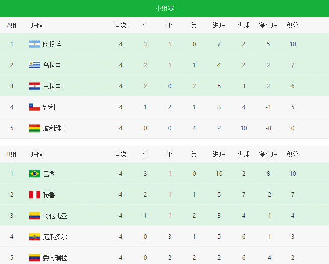 美洲杯小组最终排名!巴西阿根廷头名晋级,1/4决赛对阵出炉
