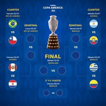 24直播网讯 在1/4决赛中,下半区阿根廷将遭遇厄瓜多尔,乌拉圭迎战哥伦比亚。上半区巴西遭遇智利,秘鲁则将迎来巴拉圭。